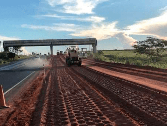 O RoadCem é aplicado com cimento e solo local, reduzindo em até 70% o tempo de execução da obra, comparando ao modelo tradicional.